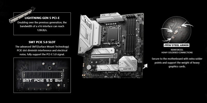 Mainboard PC MSI MAG B760M MORTAR WIFI II với giao diện PCIe x16 5.0 cho băng thông lên đến 128Gbps và cung cấp hỗ trợ NVMe SSD RAID để tăng hiệu suất đáng kinh ngạc. Tạo cấu hình RAID với thiết bị lưu trữ PCIe để tận hưởng tốc độ truyền dữ liệu nhanh nhất.