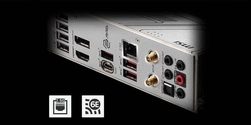 Mainboard PC MSI MAG B760M MORTAR WIFI II cung cấp các tùy chọn kết nối mới nhất cho mạng siêu mượt và truyền tệp nhanh chóng, kết hợp mạng không dây Wifi 6E cùng mạng Lan 2.5Gb với khả năng kết nối tốc độ vượt trội để bạn chơi game mượt mà hơn, không bị giật lag.