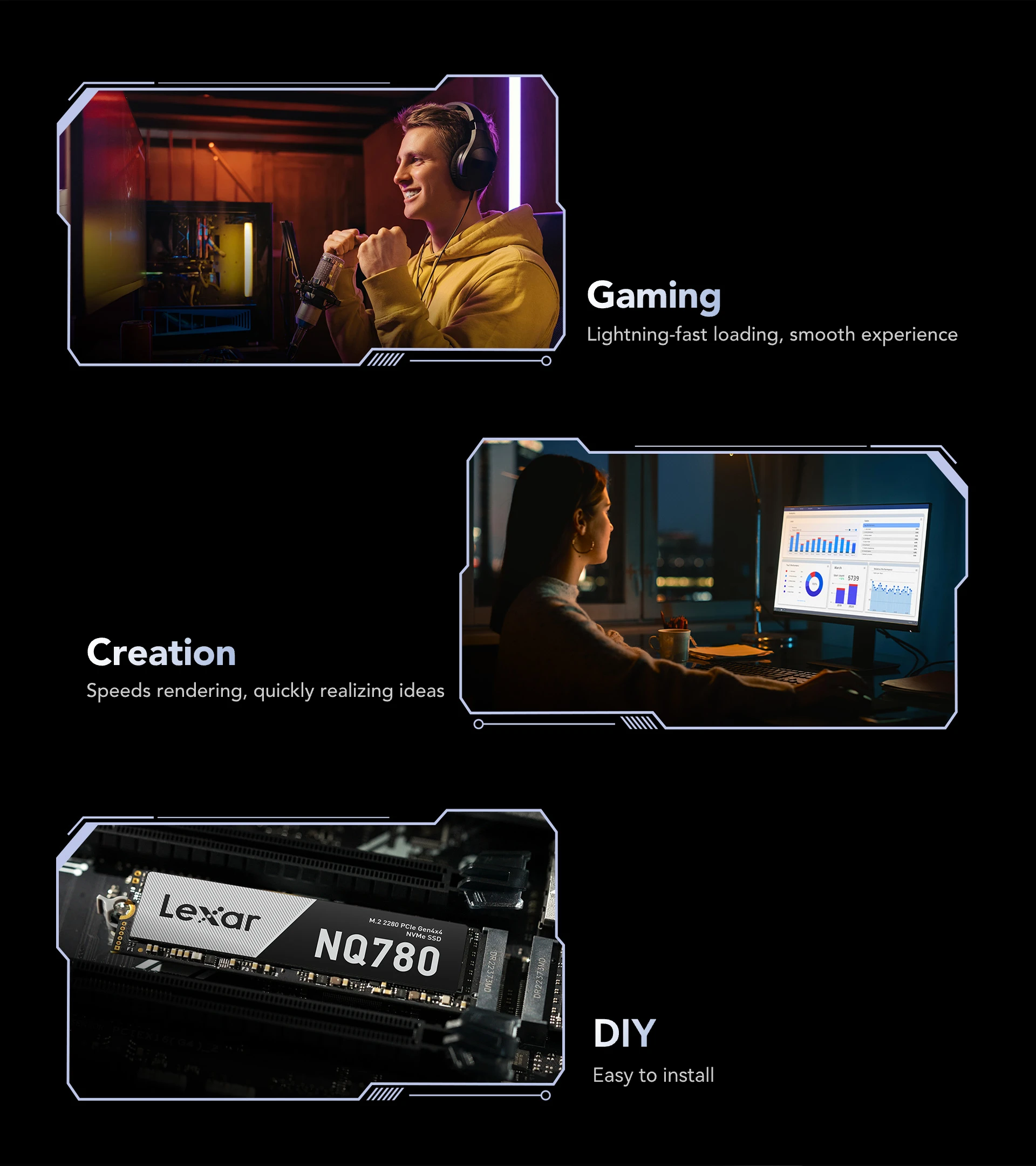 SSD Lexar NQ780 1TB là giải pháp lưu trữ hiệu suất cao, được thiết kế để tối ưu hóa tốc độ và trải nghiệm cho người dùng PC, laptop gaming, và các chuyên gia sáng tạo nội dung. Với giao diện PCIe Gen 4x4 NVMe tiên tiến, ổ cứng này mang lại tốc độ truy xuất dữ liệu cực nhanh, giúp giảm đáng kể thời gian khởi động hệ điều hành, tải ứng dụng nặng và trò chơi.