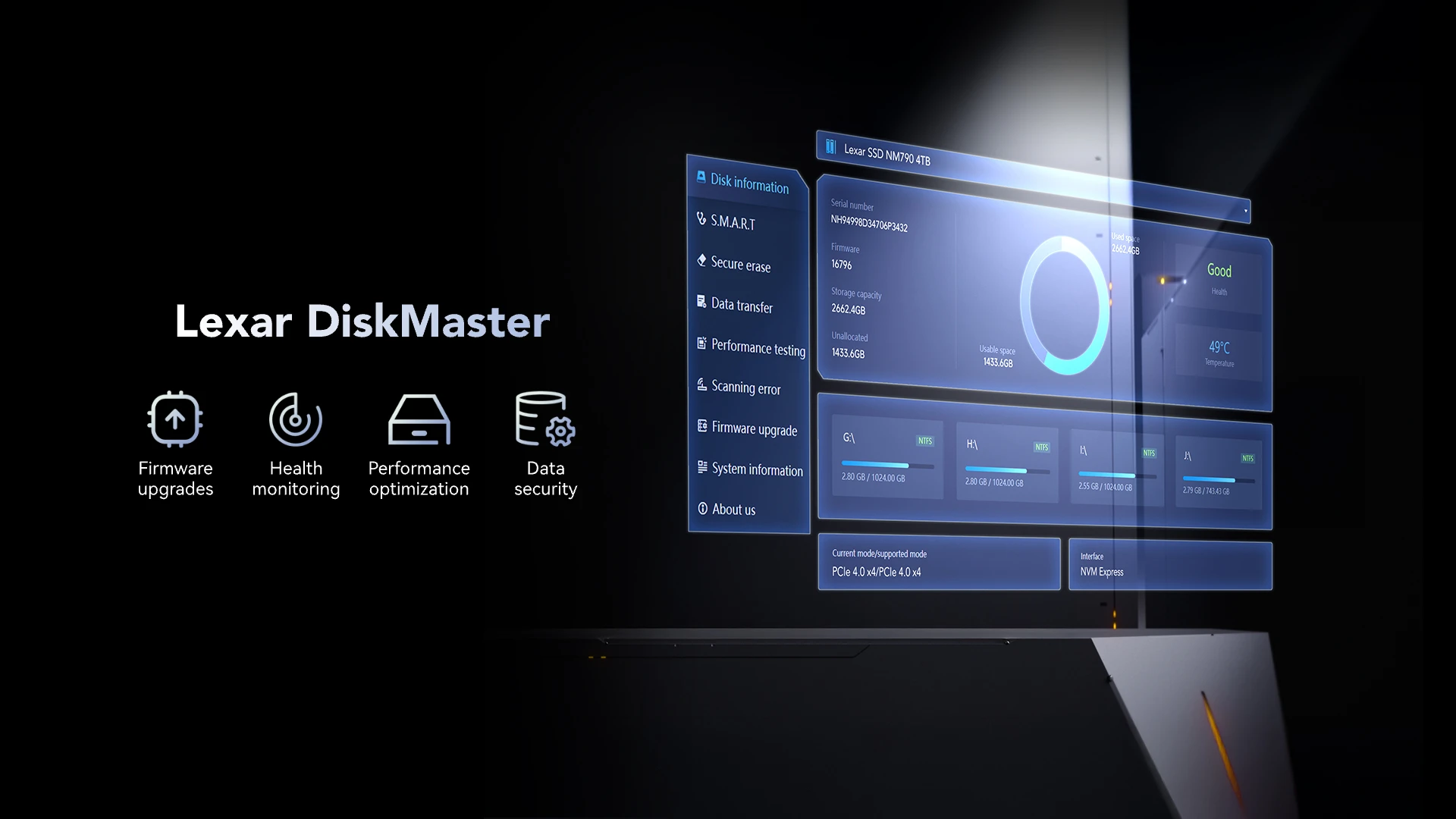 | Phần mềm quản lý | Lexar DiskMaster (Hỗ trợ cập nhật firmware, theo dõi sức khỏe ổ đĩa) |